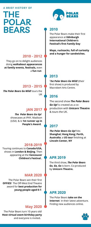 Happy Birthday Polar Bears! Fiona and Ivor started The Polar Bears in 2010! First appearing at Edinburgh International Childrens Festival first Family Day, we found our first costumes in charity shops and customised them ourselves and created a walk-about inter-active performance. It’s really amazing to see how far we have come! Here’s a look back at some of our land-mark moments.